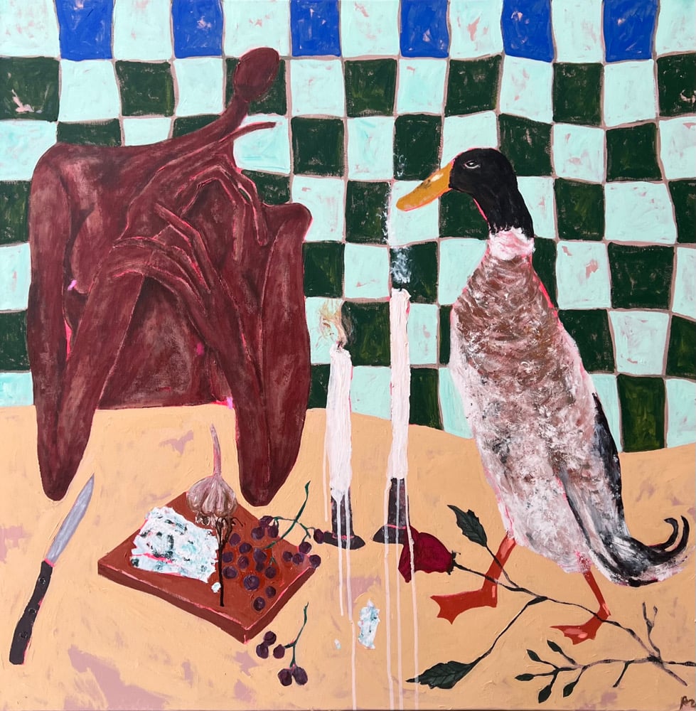 Acrylic, colored pencil, ink, paint marker and oil pastel on canvas
