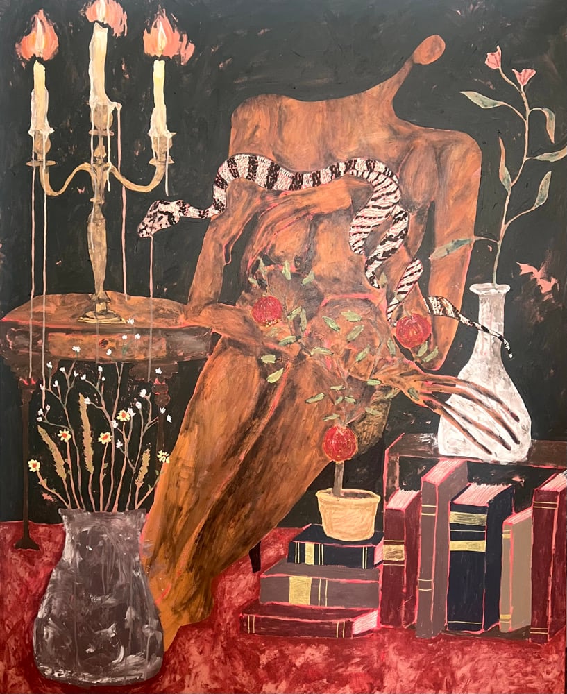 Acrylic, paint marker and oil pastel on canvas